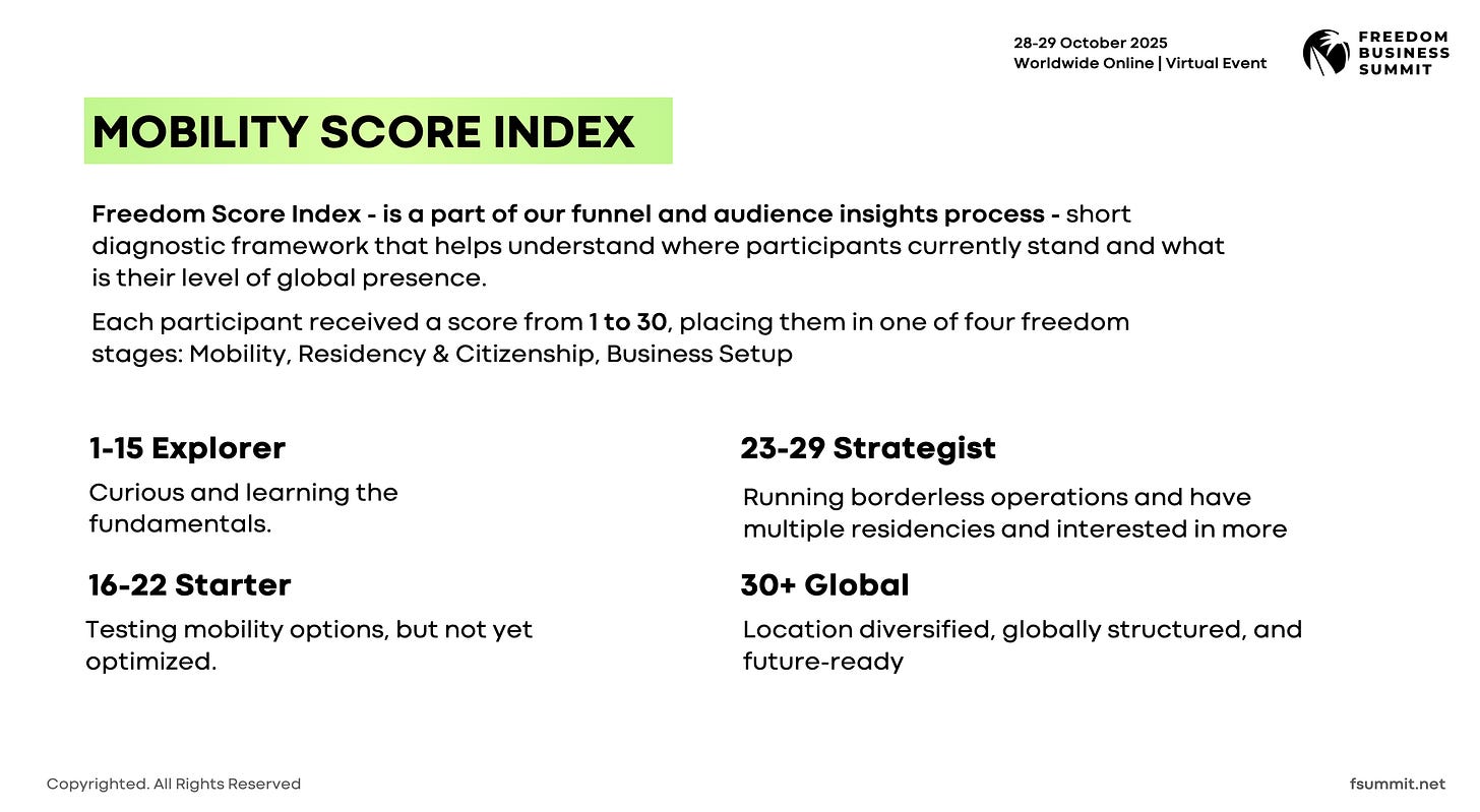 From their responses, we built the Global Mobility & Freedom Score Index - a 30-point framework measuring how “globally free” a person or company really is.